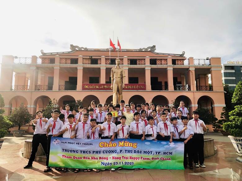 Nhằm giáo dục truyền thống cách mạng và rèn luyện kỹ năng sống cho thế hệ trẻ, ngày 23/11/2025 vừa qua, Trường THCS Phú Cường đã tổ chức thành công chuyến tham quan học tập ngoại khóa đầy ý nghĩa tại Bến Nhà Rồng và Nông trại Happy Farm cho 194 học sinh khối 6 và khối 7 với tinh thần hào hứng và ý thức kỷ luật cao.