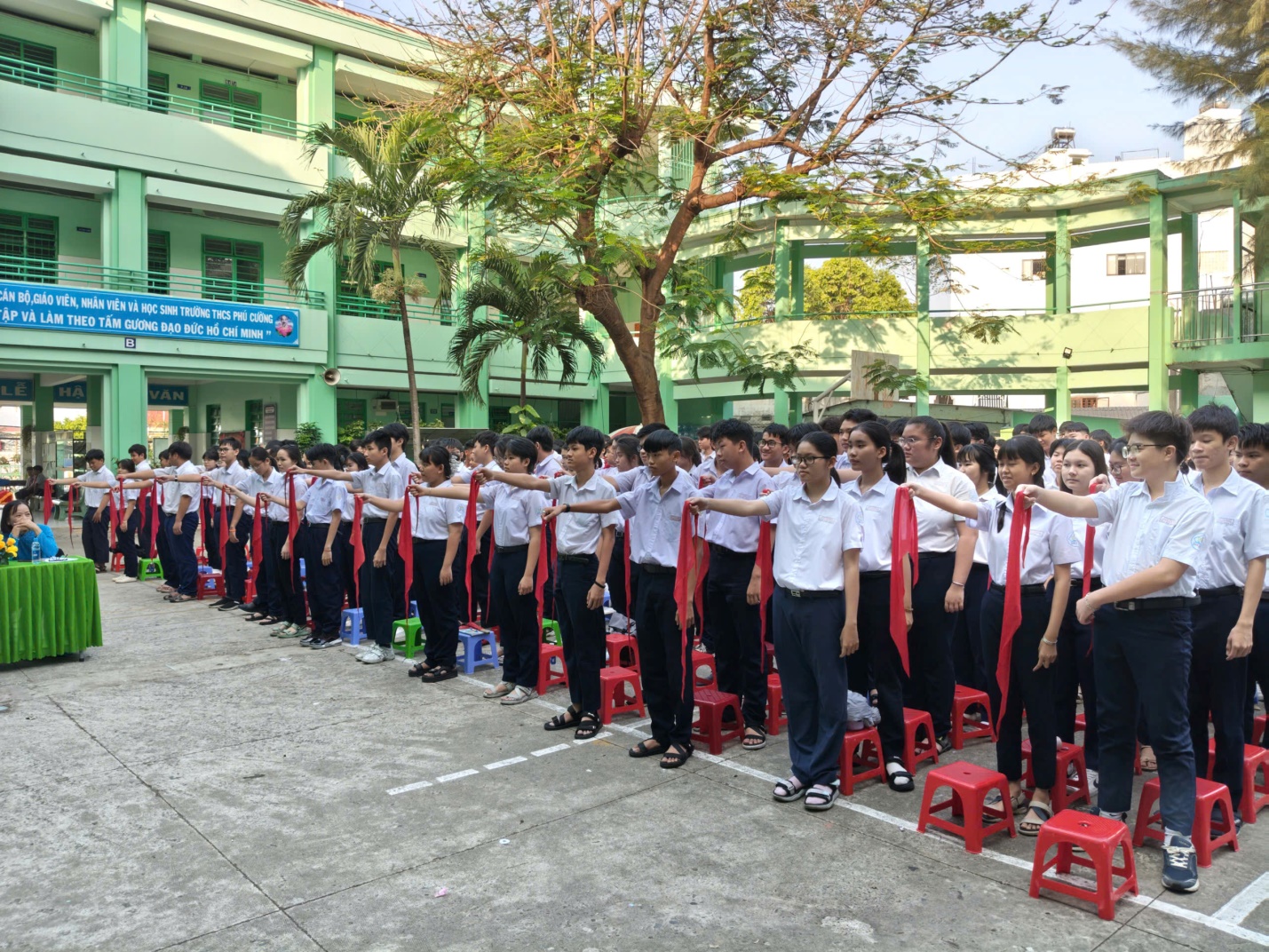 Buổi lễ diễn ra trong không gian ấm cúng nhưng không kém phần trang nghiêm. 306 gương mặt đội viên tiêu biểu của khối 9 hôm nay mang trong mình những cảm xúc bồi hồi khó tả. Những chiếc khăn quàng đỏ – biểu tượng của lòng tự hào và sự gắn bó suốt 7 năm qua – giờ đây được các em tháo xuống, gấp lại cẩn thận như cất giữ những kỷ niệm đẹp nhất của tuổi học trò.