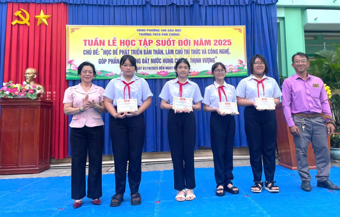 Buổi lễ trở nên ý nghĩa hơn khi nhà trường tổ chức trao thưởng cho các cá nhân và tập thể đạt thành tích nổi bật trong các cuộc thi hùng biện, kể chuyện theo sách, sáng tác ca khúc và vẽ tranh bằng AI. Mỗi giải thưởng chính là sự ghi nhận và khích lệ cho tinh thần sáng tạo – tự học của học sinh Phú Cường.