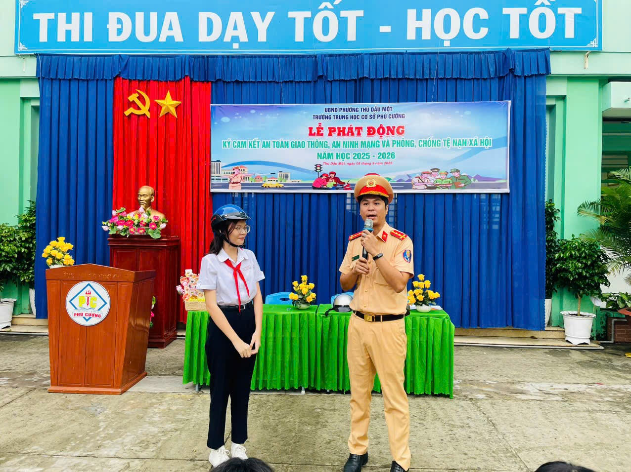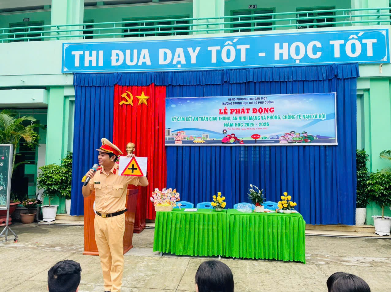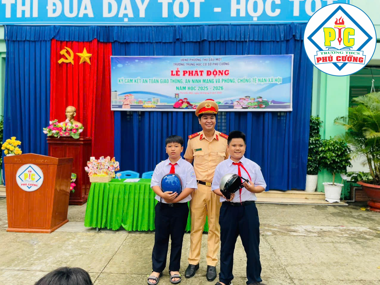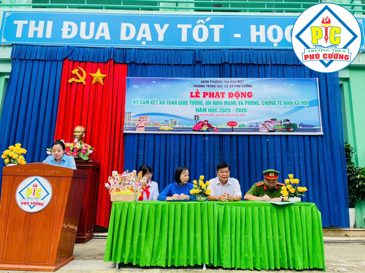 Trong chương trình, học sinh đã được nghe cán bộ Công an tuyên truyền về tác hại của ma túy, các quy định pháp luật liên quan và kỹ năng tham gia giao thông an toàn. Đồng thời, nhà trường, Ban đại diện Cha mẹ học sinh và Công an phường đã cùng ký Bản cam kết An toàn giao thông. Đại diện học sinh – em Vày Thượng Gia Nghi, lớp 8A1, Liên đội trưởng – cũng đã thay mặt toàn trường ký Bản đăng ký “Chiến sĩ an ninh nhỏ”, thể hiện quyết tâm của tuổi trẻ Phú Cường.
