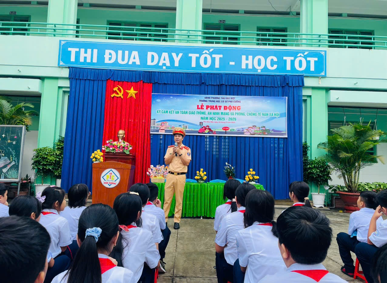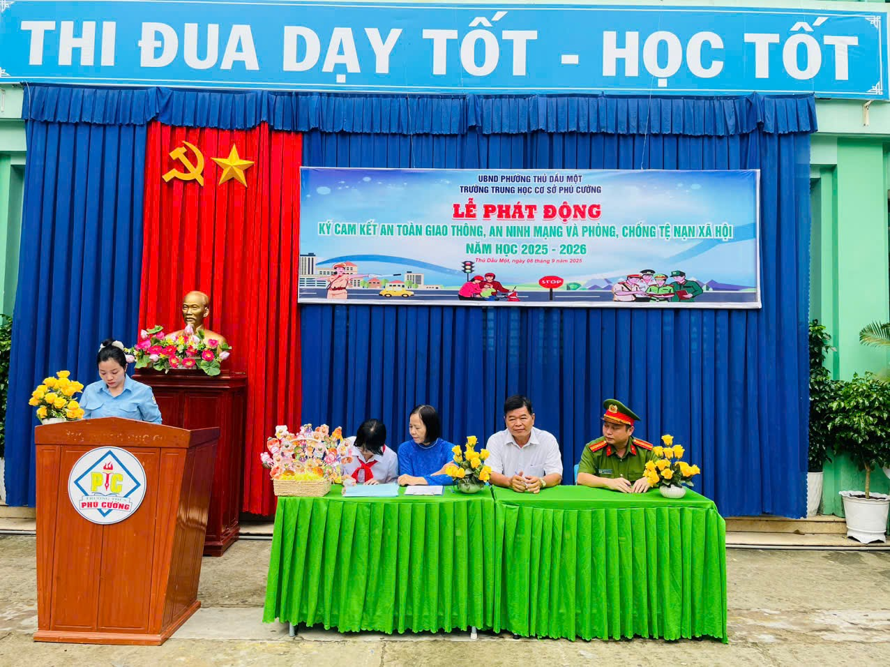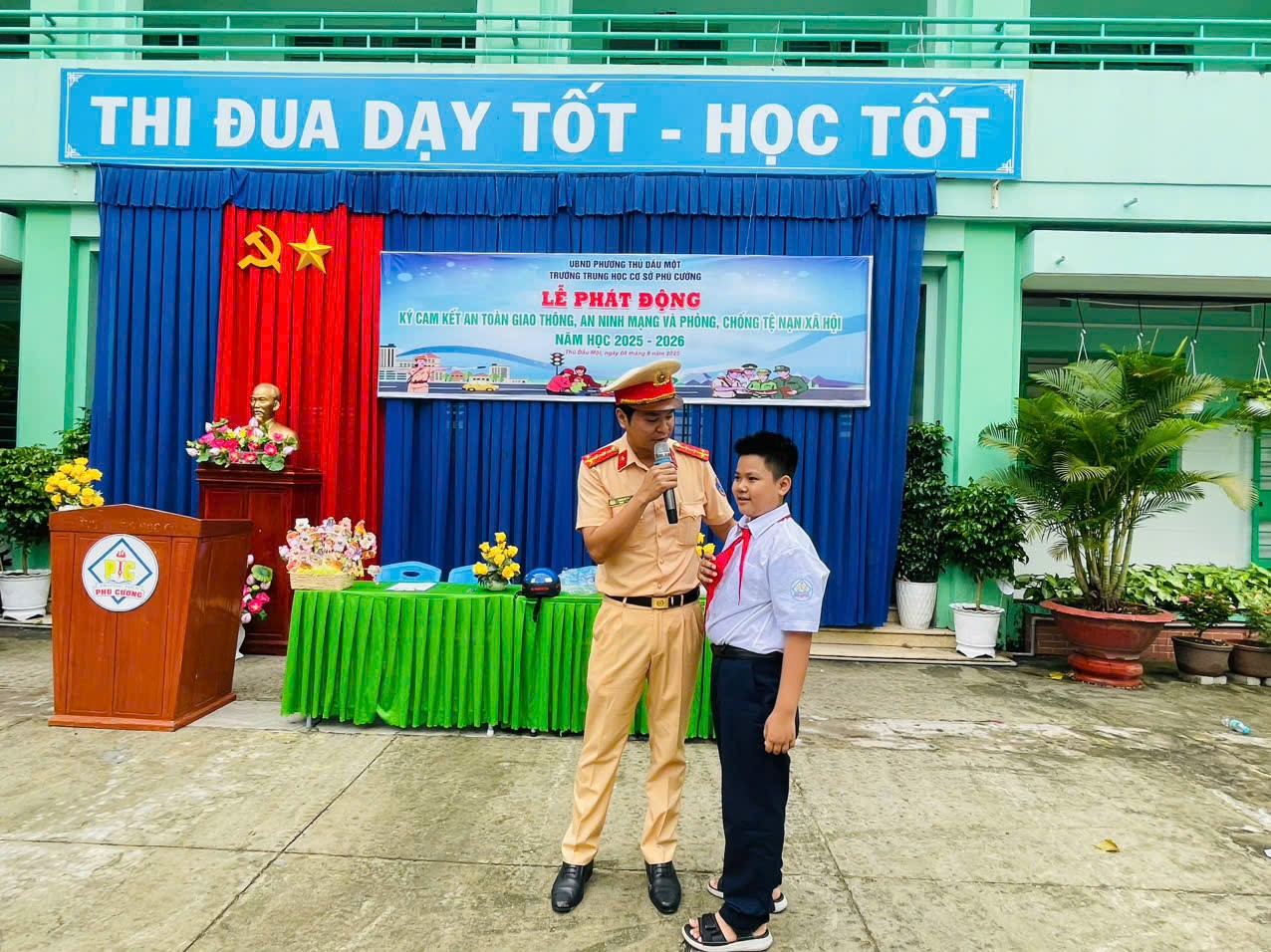 Trong chương trình, học sinh đã được nghe cán bộ Công an tuyên truyền về tác hại của ma túy, các quy định pháp luật liên quan và kỹ năng tham gia giao thông an toàn. Đồng thời, nhà trường, Ban đại diện Cha mẹ học sinh và Công an phường đã cùng ký Bản cam kết An toàn giao thông. Đại diện học sinh – em Vày Thượng Gia Nghi, lớp 8A1, Liên đội trưởng – cũng đã thay mặt toàn trường ký Bản đăng ký “Chiến sĩ an ninh nhỏ”, thể hiện quyết tâm của tuổi trẻ Phú Cường.