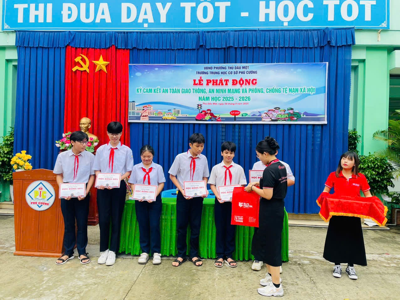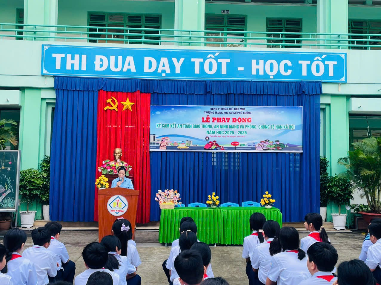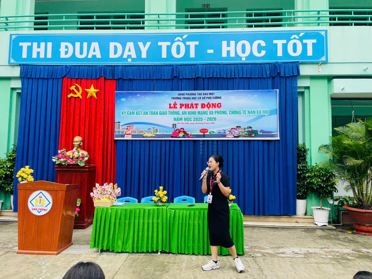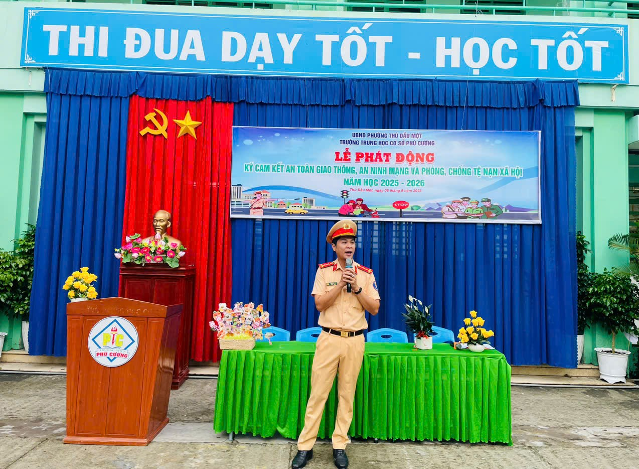 Trong chương trình, học sinh đã được nghe cán bộ Công an tuyên truyền về tác hại của ma túy, các quy định pháp luật liên quan và kỹ năng tham gia giao thông an toàn. Đồng thời, nhà trường, Ban đại diện Cha mẹ học sinh và Công an phường đã cùng ký Bản cam kết An toàn giao thông. Đại diện học sinh – em Vày Thượng Gia Nghi, lớp 8A1, Liên đội trưởng – cũng đã thay mặt toàn trường ký Bản đăng ký “Chiến sĩ an ninh nhỏ”, thể hiện quyết tâm của tuổi trẻ Phú Cường.