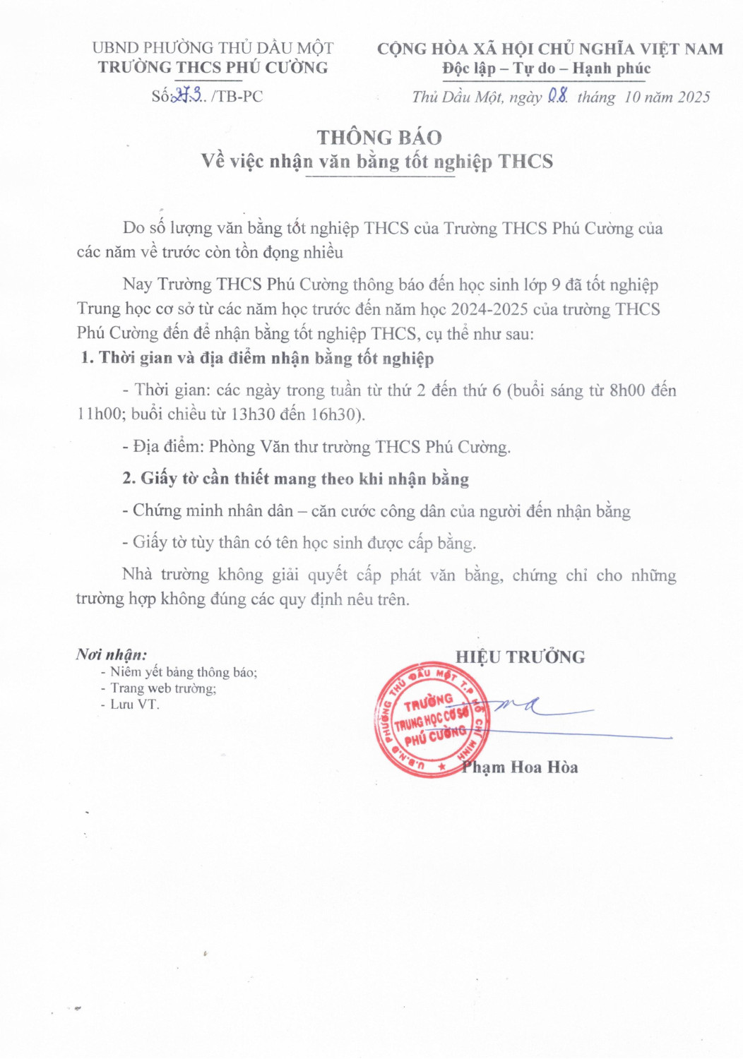Trường THCS Phú Cường thông báo đến các em học sinh tốt nghiệp THCS năm học 2024-2025 đến tại trường nhận bằng tốt nghiệp.