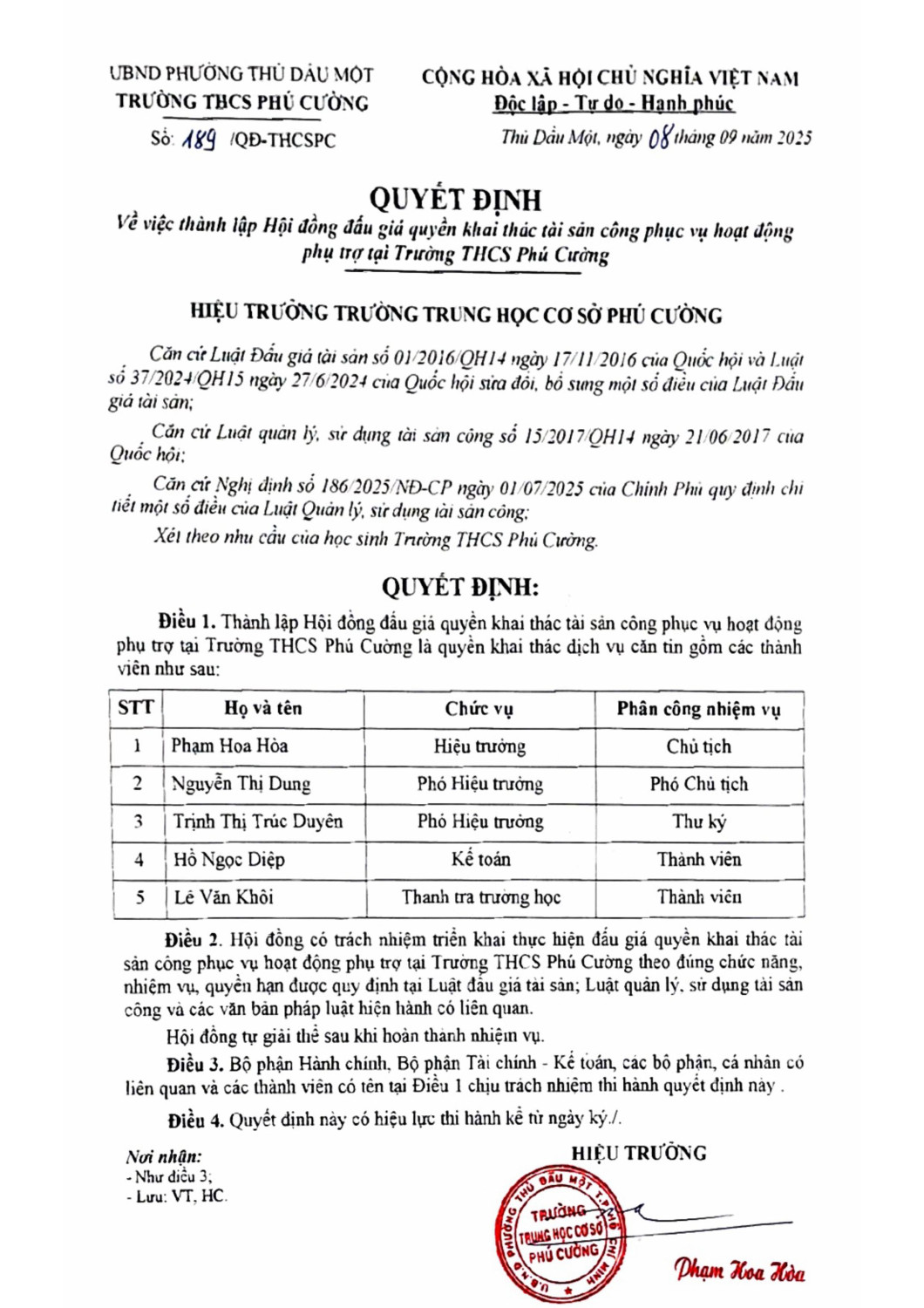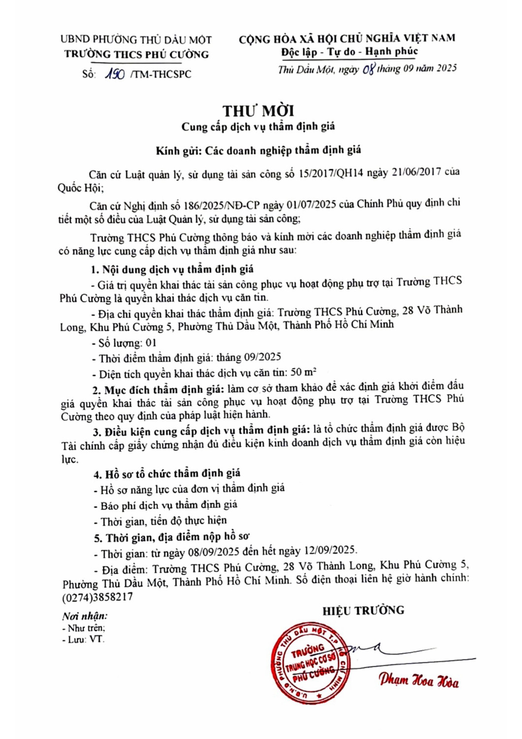 Năm học 2025 - 2026, Trường THCS Phú Cường thực hiện đấu giá khai thác dịch vụ căn tin phục vụ học sinh.